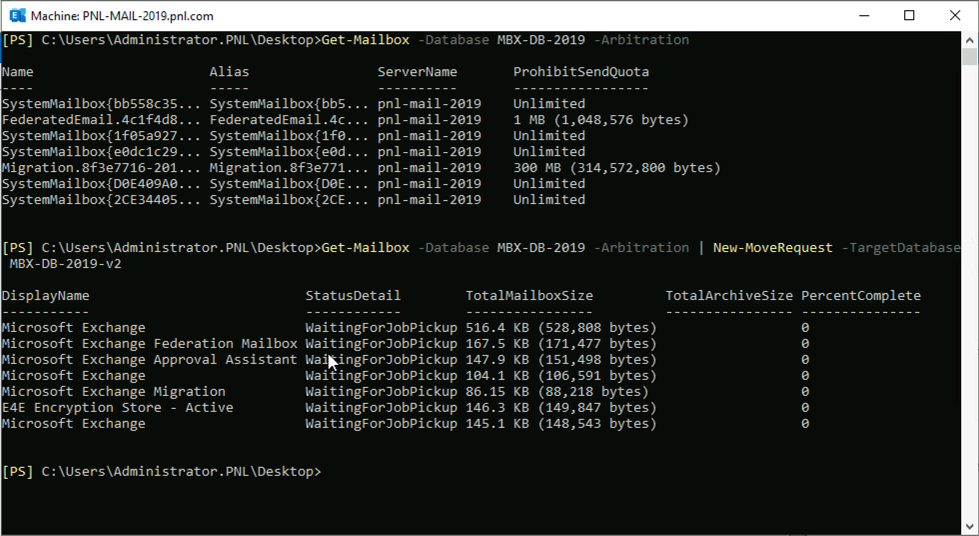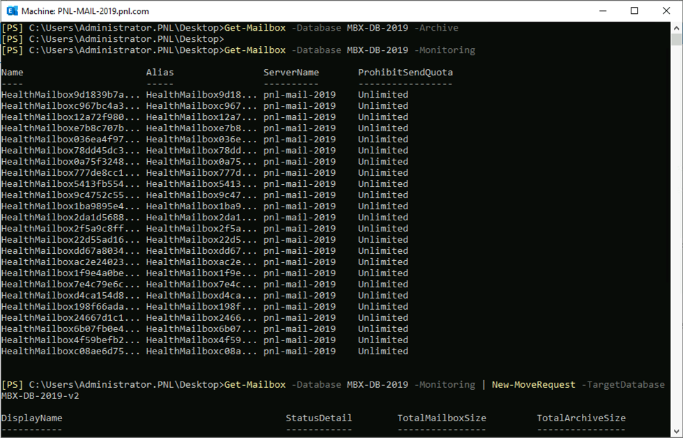 5. 이것이 모든 ‘사용자’ 사서함이지만 원본 데이터베이스 서버에 시스템 사서함이 있을 수 있습니다. 이러한 사서함은 중재 사서함 또는 보관 사서함(또는 둘 다)입니다. 보관 사서함은 없지만 중재 사서함은 있습니다. 데이터베이스를 확인하려면 다음 명령을 사용하십시오.